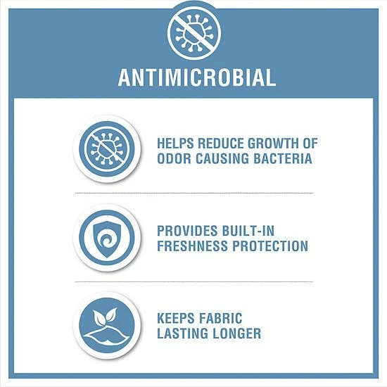 - Anti-microbial treatment for health and wellness – helps reduce the growth of odor causing bacteria and keeps fabric lasting longer