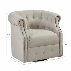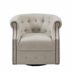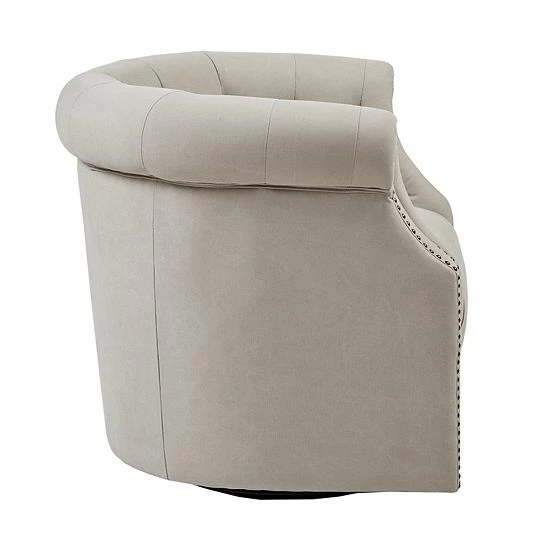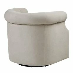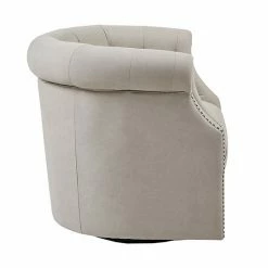 The Madison Park Admiral Swivel Chair provides a chic transitional addition to your home dรฉcor. Featuring a low barrel back with button tufting accents, this swivel chair is upholstered in a beige fabric that creates a linen-like appearance.