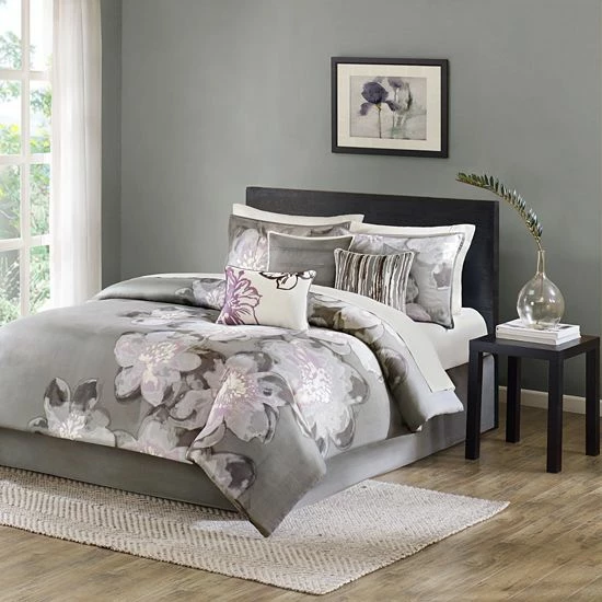 The Madison Park Alicia 7-piece printed comforter set offers a soft touch of beauty to your bedroom.