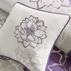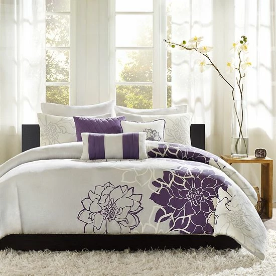 Featuring an oversized floral print and embroidered decorative pillows, this Madison Park Bridgette Duvet Cover set transforms your room into paradise. In purple/multi.