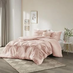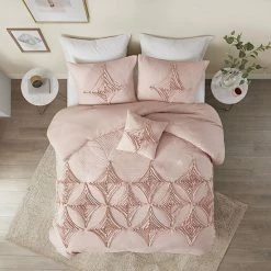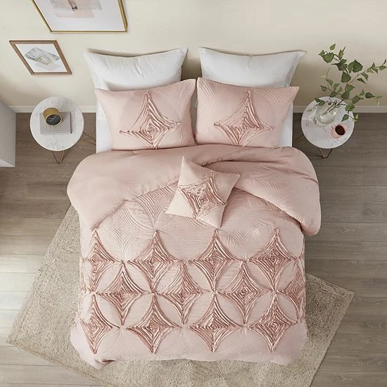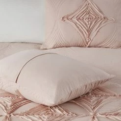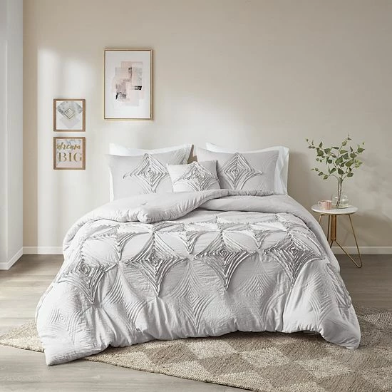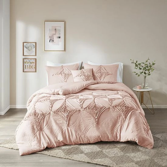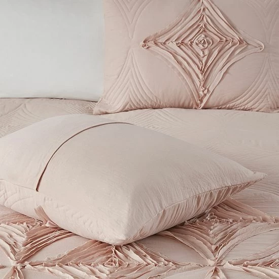 Create a relaxing vibe in your bedroom with the Madison Park Emiliana 4 Piece Comforter Set. The comforter flaunts an applique diamond design that adds dimension and a quilting diamond pattern to create a sophisticated shabby chic look.