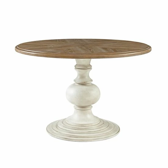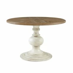 The Madison Park Hemlock Dining Table provides a charming farmhouse allure for your dining room decor. This round dining table features a diamond veneer top in a reclaimed walnut wood finish. An antique cream finish on the pedestal base beautifully complements the table top, creating a warm farmhouse look. With its simple design, this round dining table pairs easily with your decor and serves as the focal point of your dining space. Assembly is required and tools are included for your convenience.