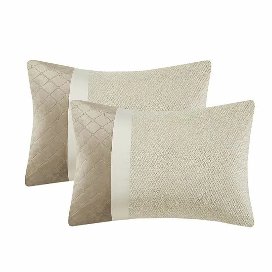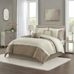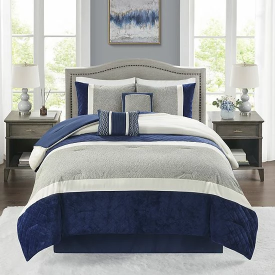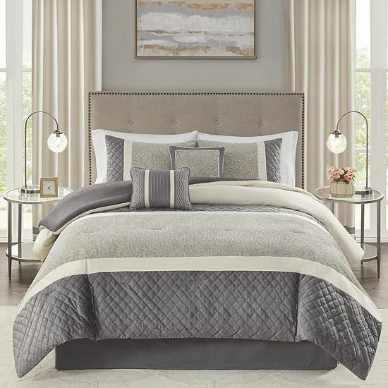 - The Madison Park Klein comforter and sham set offers a chic modern update to your bedroom. The comforter is pieced together with a solid poly charmeuse, solid mink with pinsonic quilting, and a polyester textured fabric to create dimension and a luxurious look. A solid microfiber reverse complements the top of the bed.
