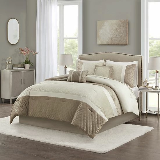 - The Madison Park Klein comforter and sham set offers a chic modern update to your bedroom. The comforter is pieced together with a solid poly charmeuse, solid mink with pinsonic quilting, and a polyester textured fabric to create dimension and a luxurious look. A solid microfiber reverse complements the top of the bed.