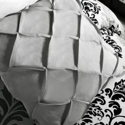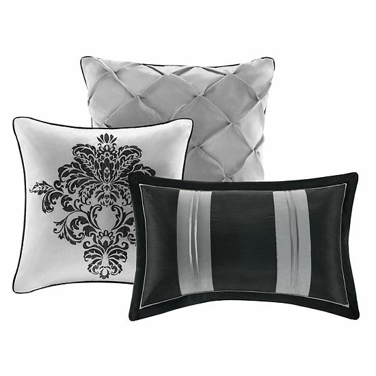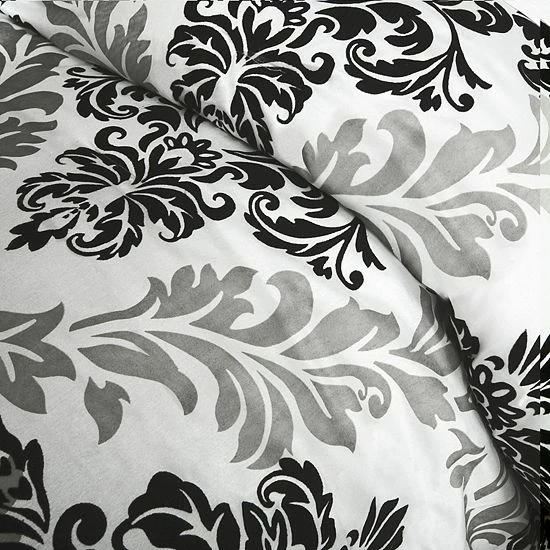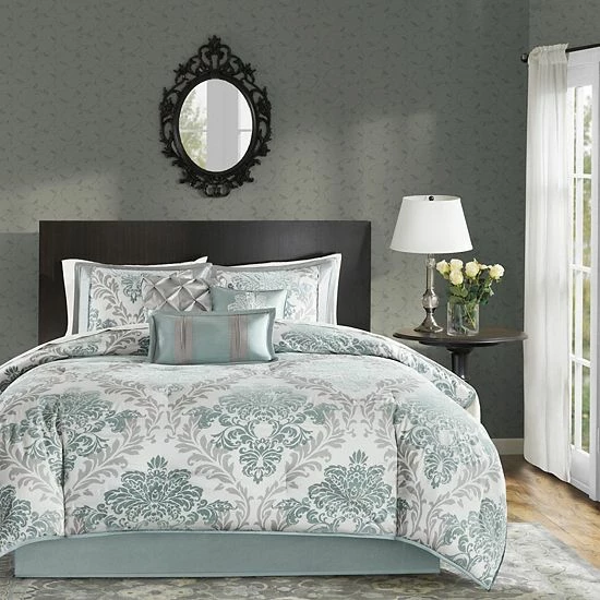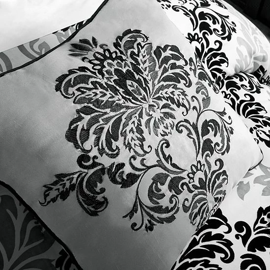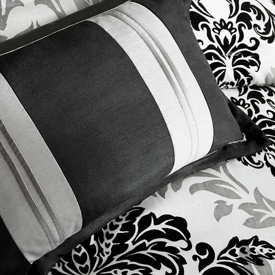 For a more contemporary look, the Madison Park Larissa Collection is perfect for your home. Its damask print is printed on polyester and paired with damask flocking for a three dimensional look to this comforter and shams. Three decorative pillows feature piecing and stipe details to complete this look.ย