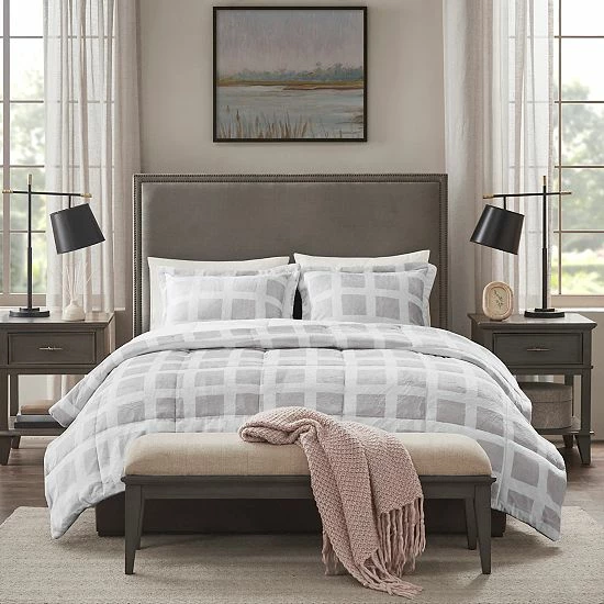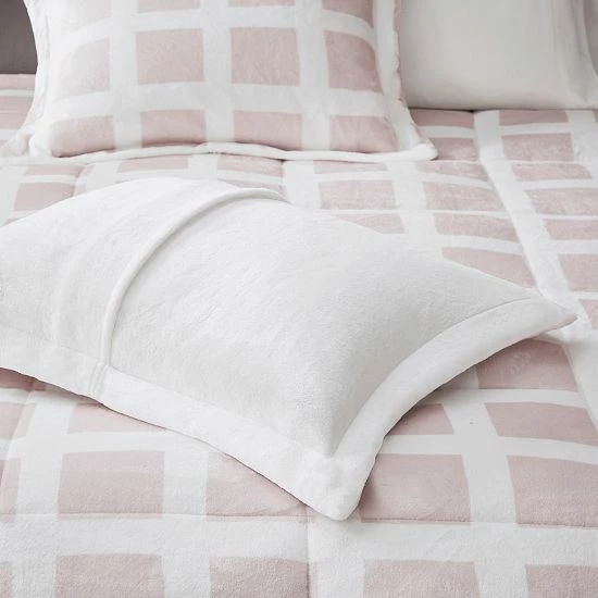 Sleep soundly in the pure plush comfort of the Madison Park Mae plush comforter set. The comforter features a geometric print on the plush face with a solid white reverse to create luxurious look and feel.
