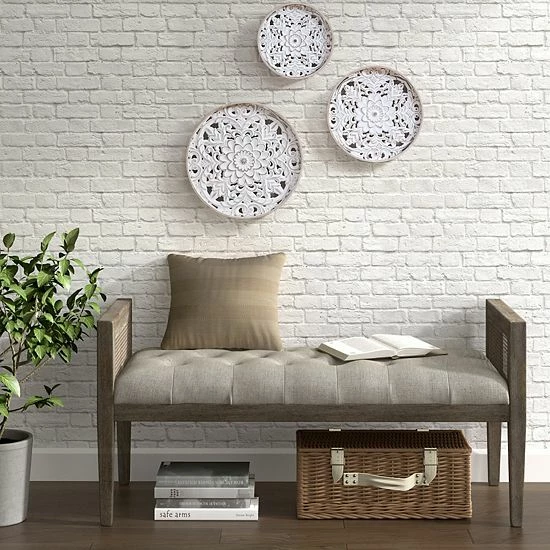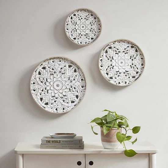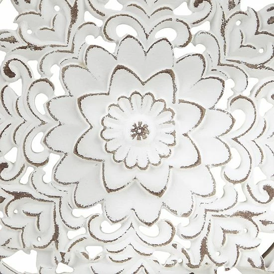 - Each round piece features a fir wood frame with an intricate white wood medallion design in the center, for the perfect charming and vintage touch to any space.