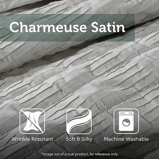 - Satin charmeuse fabric on top of the bed, solid microfiber on reverse