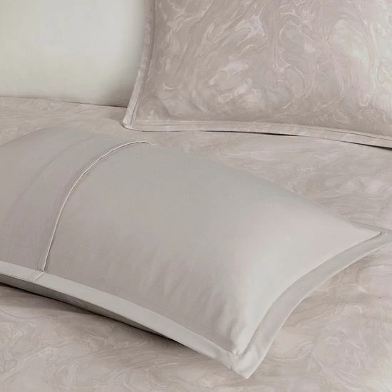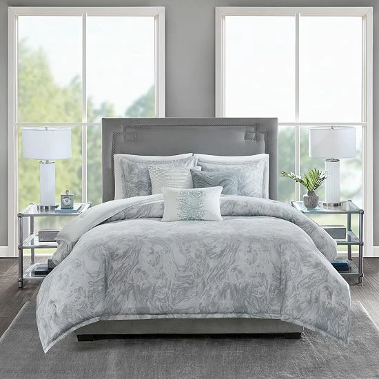 - Cotton sateen comforter and shams flaunt a printed marble pattern for contemporary allure
