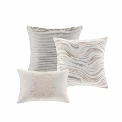 - Three decorative pillows with embroidered details and fabric manipulation coordinate beautifully