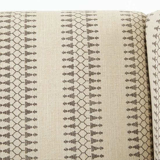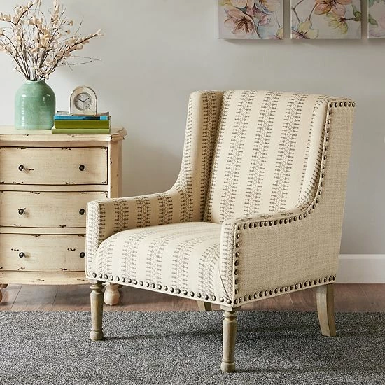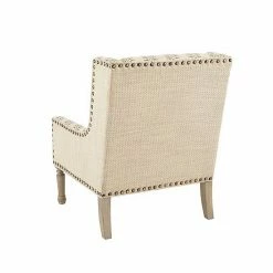 Give your living space a charming farmhouse touch with the Madison Park Tita Accent Chair. This wing-back style chair is upholstered in a natural and tan fabric that creates a rich contrasting look. A bronze nail head trim adorns the front of the chair adding an elegant accent, while turned solid wood legs with a reclaimed natural finish complement the design. Incorporate this farmhouse style accent chair into your living room and enjoy its simple and charming comfort. Leg assembly is required and tools are included for your convenience.